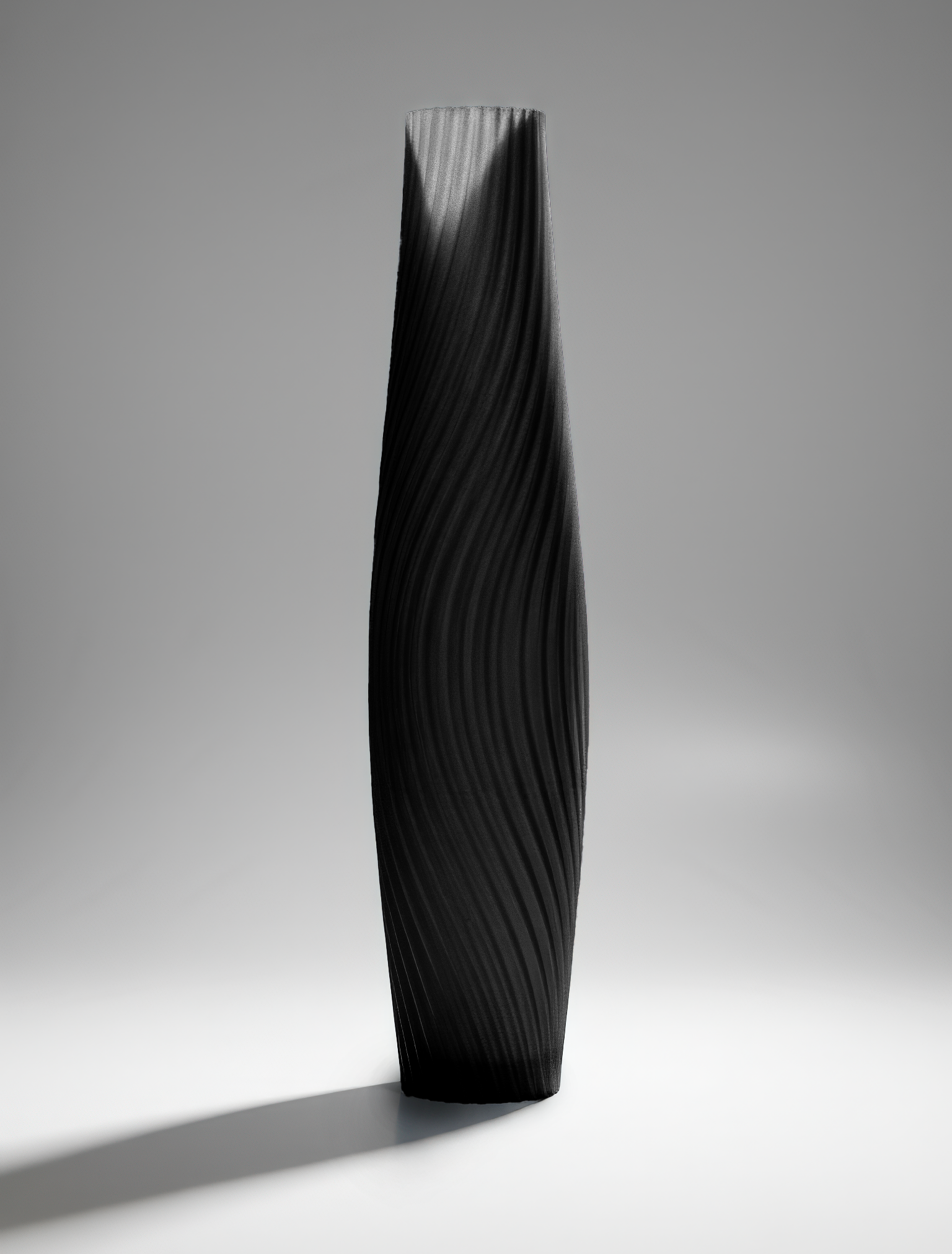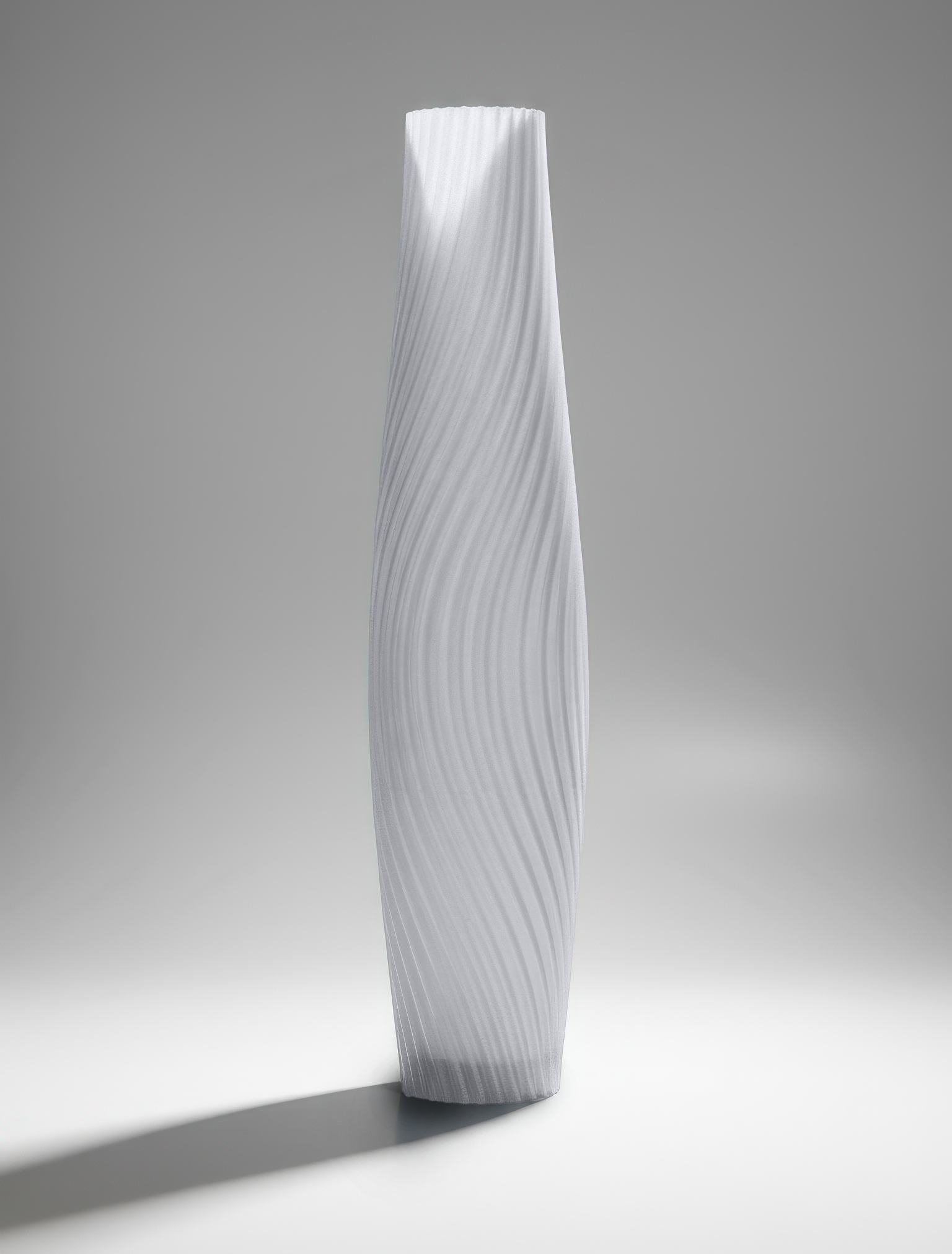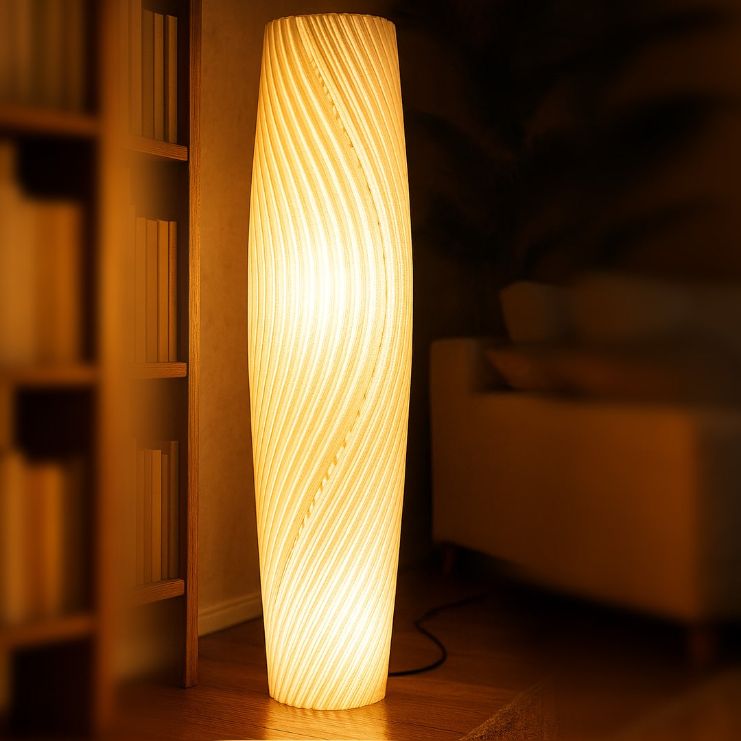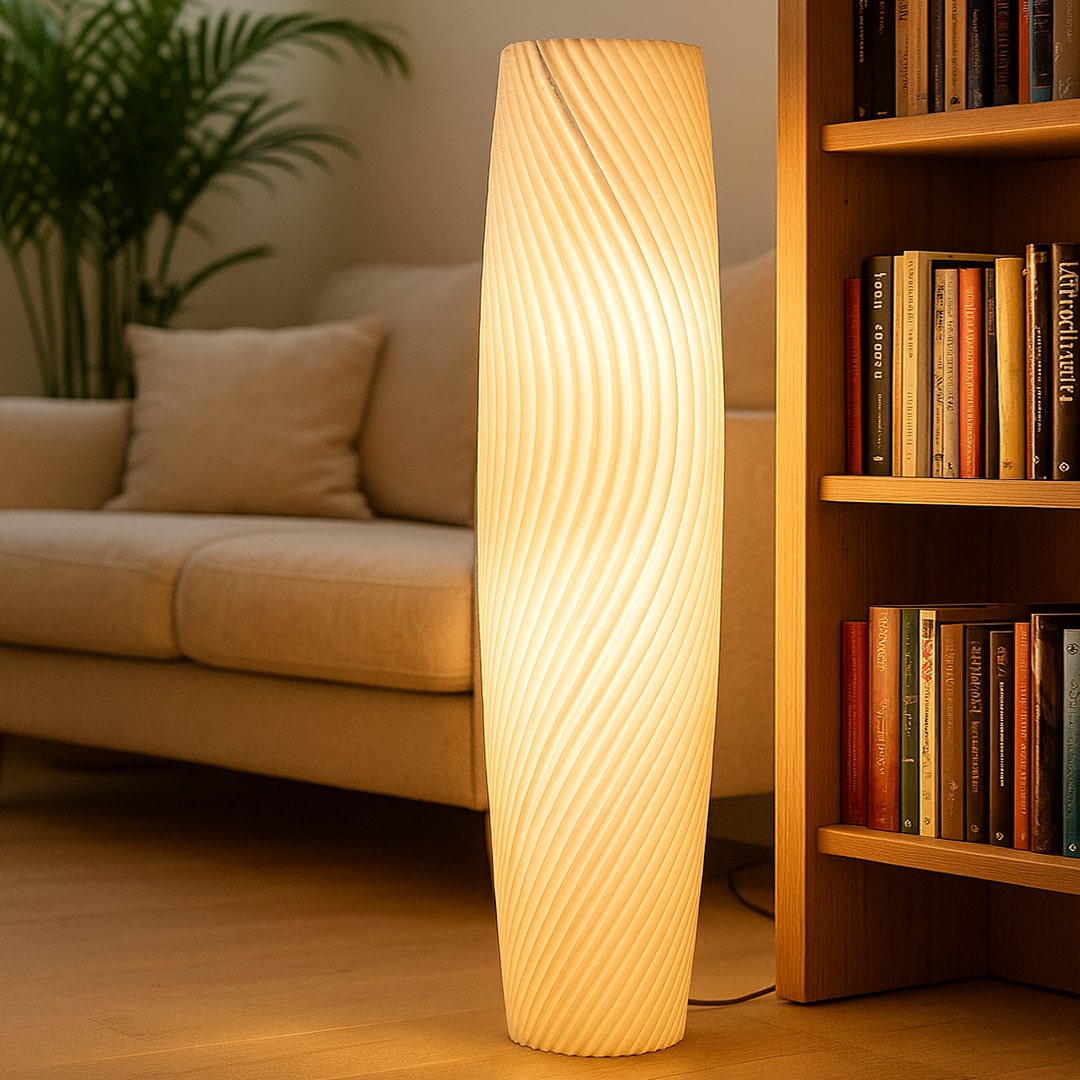 With soft, spiraling ridges that wrap gently around its elongated form, Lira casts a warm, ambient glow that enhances any space. The 3D printed texture adds depth and elegance, creating a sculptural presence even when unlit. Minimal yet expressive, Lira is a serene lighting piece designed to complement modern living.