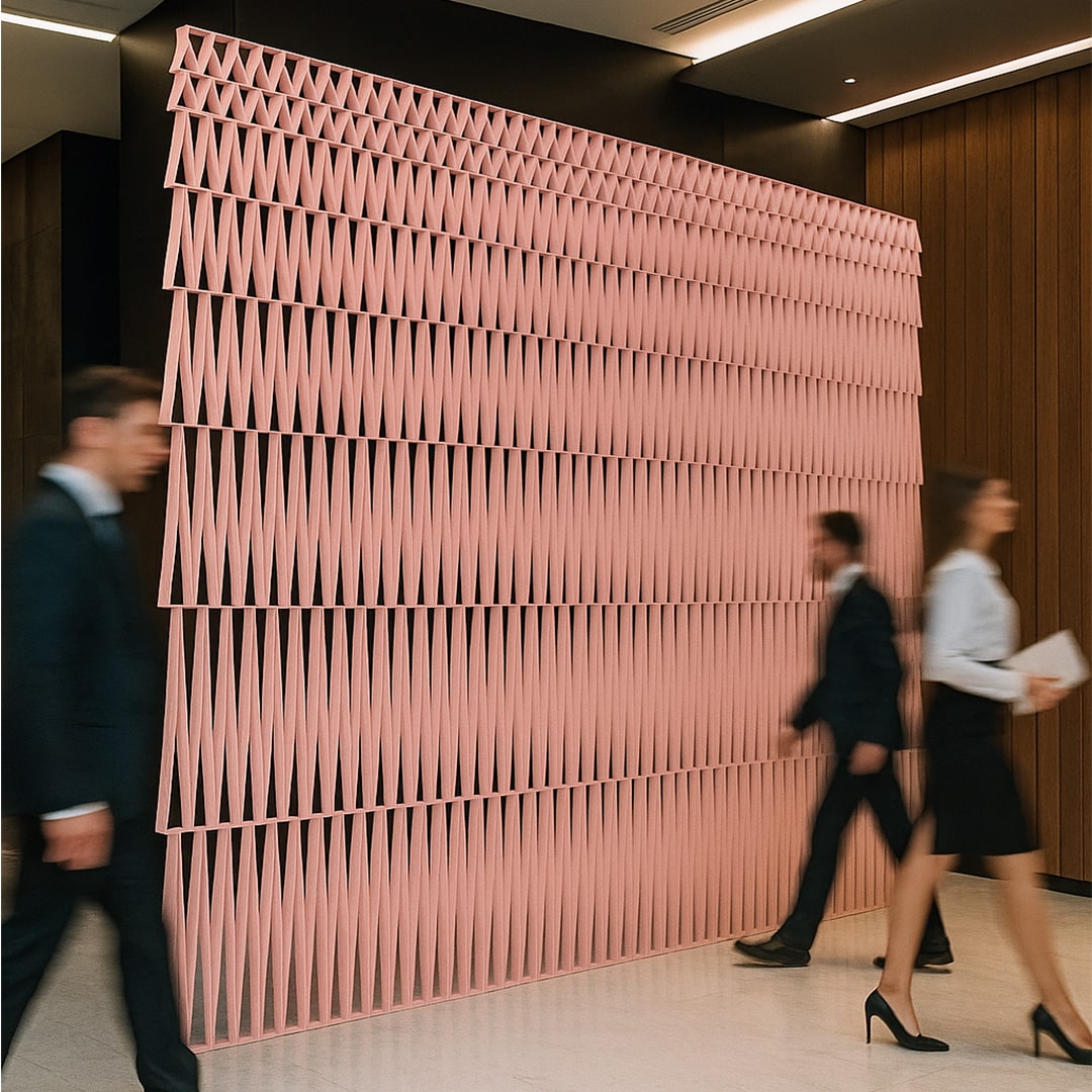 Strata is a dynamic partition screen that layers rhythm and repetition into architectural elegance. Composed of angled, diamond-like segments, it plays with light and shadow to create visual movement across its surface. Ideal for dividing space without enclosing it, Strata adds depth, texture, and a contemporary presence to modern interiors.