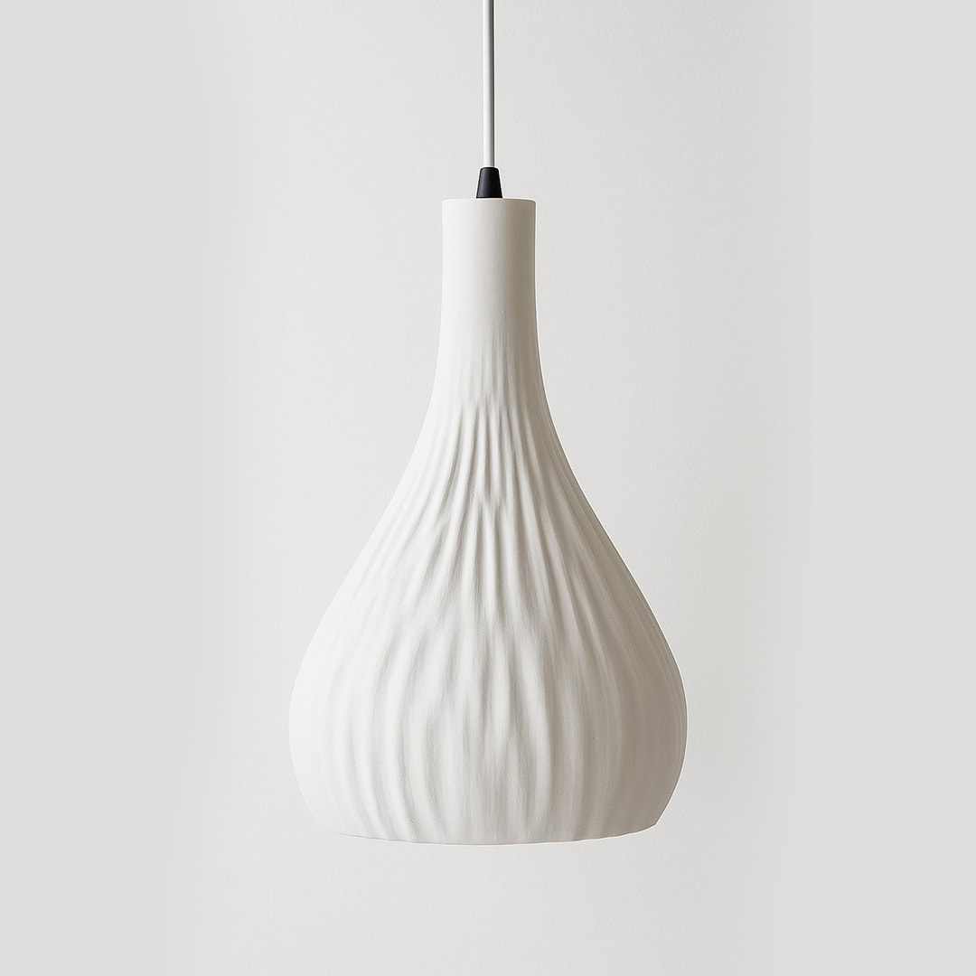Echoing the form of a dried date, Medjool pendant light features a textured, organic shell that tapers into a slender top. Its sculptural shape casts soft, atmospheric light, bringing warmth and elegance to any space. A refined blend of nature and contemporary design.